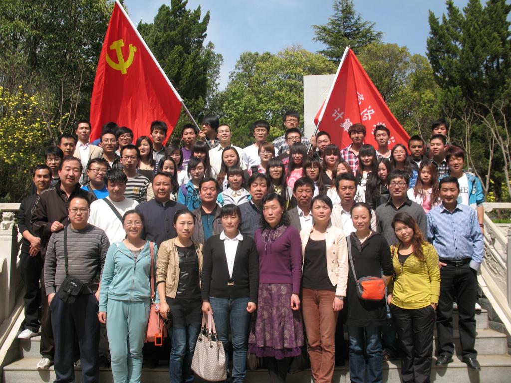 全体教师党员和学生党员、预备党员在陵园的人民英雄纪念碑前合影。