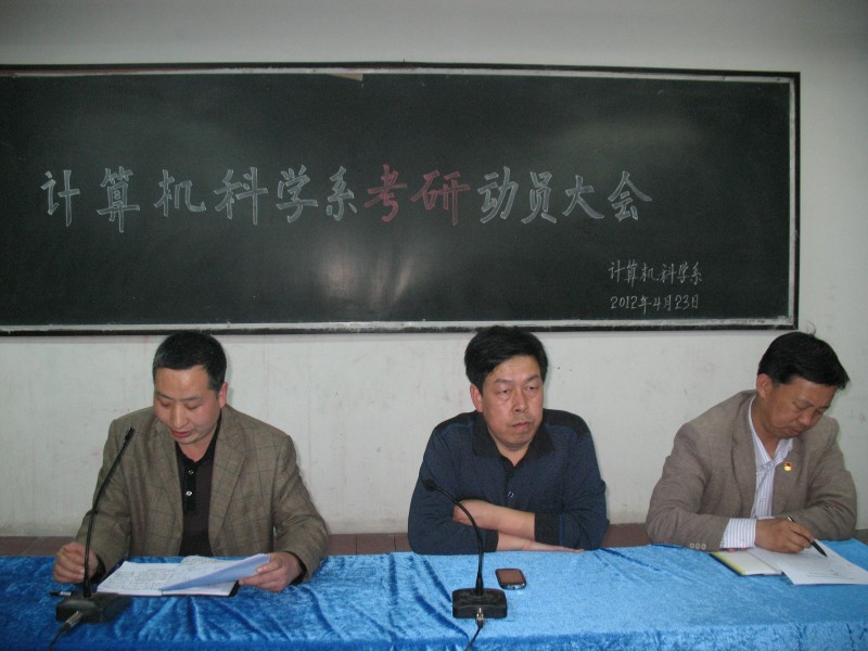 我系考研动员大会于2012年4月23日19:30在2号楼323教室召开。参加此次会议的有计算机科学系樊书记、刘主任、任主任、部分老师以及09、10级全体本科学生。