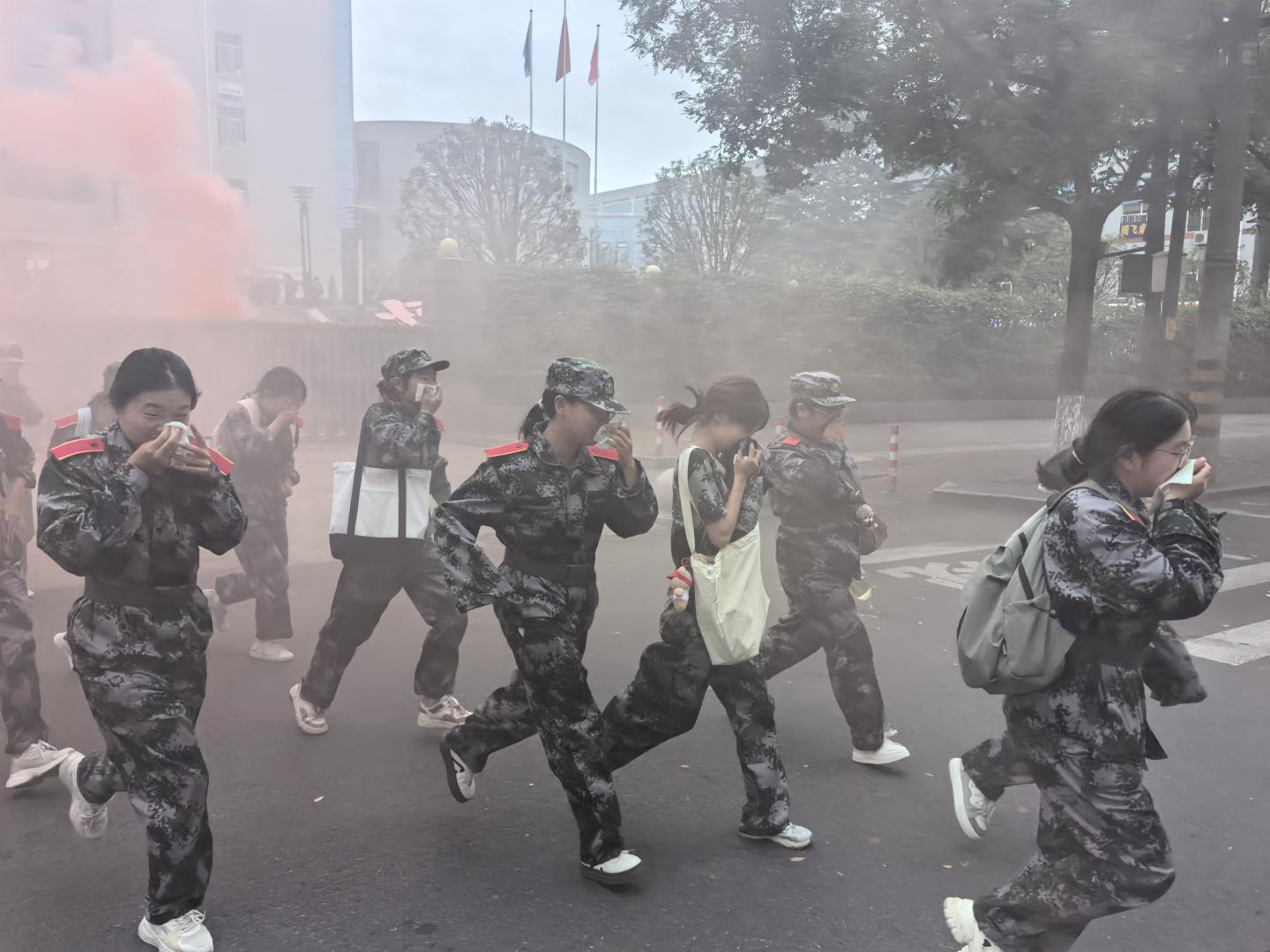 出发前,教官特意施放模拟硝烟,弥漫的烟雾瞬间营造出紧张的临战氛围,使学生们沉浸式体验了紧急行军的真实感。