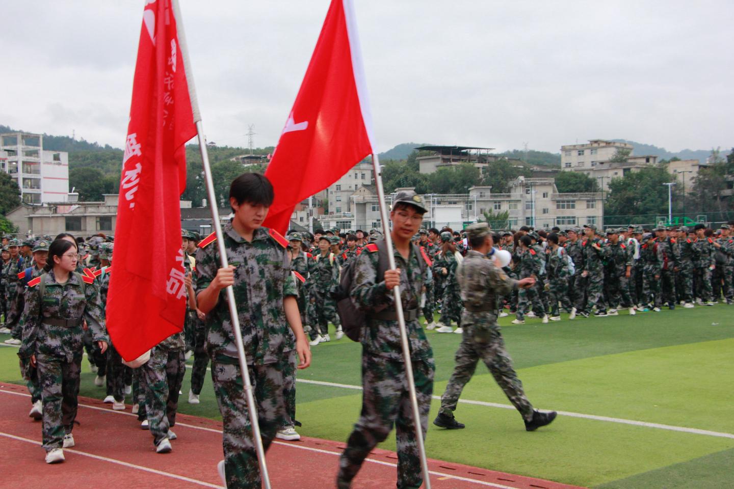 清晨六点,我院新生身着迷彩服,在操场集结完毕,整装待发。为保障路途安全,学院特地安排了15名身穿橘黄色志愿者马甲的同学作为应急力量,协助老师与教官维护秩序。