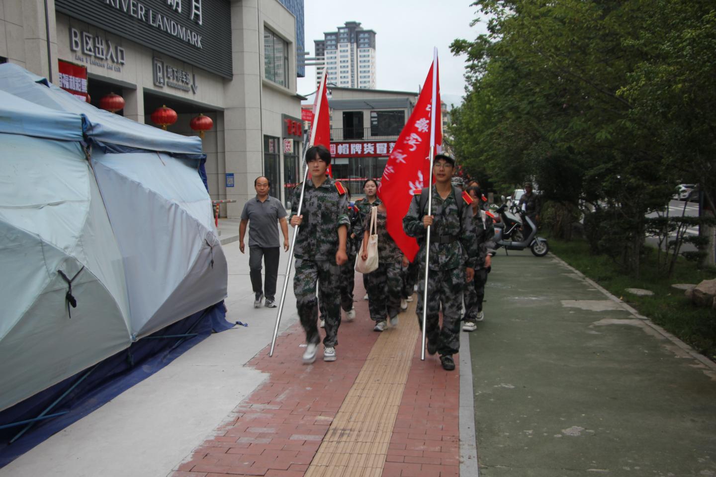 抵达目的地商鞅广场后,学院带队辅导员和志愿者贴心为同学们递上饮用水,叮嘱大家及时补充水分。随后,在教官的带领下,《强军战歌》的旋律在广场响起,我院师生齐声高歌,充分展现了全院上下的热血与朝气。