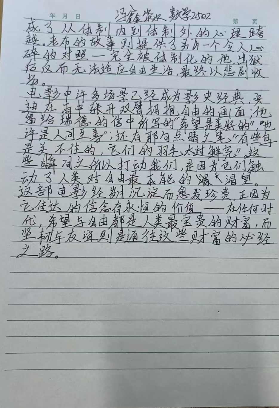 作为军训期间的特色文化活动,本次观影旨在将纪律训练与精神引领相结合。电影《肖申克的救赎》以监狱为背景,讲述主人公安迪在绝境中不放弃对自由的追求、用智慧与坚韧打破命运桎梏的故事,精准契合军训“磨砺意志、锤炼品格”的核心目标。