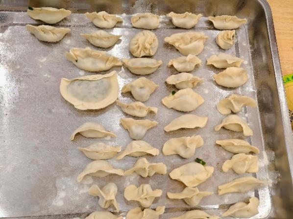 活动开始,同学们迅速分组围坐在操作台前,纷纷大显身手。手法娴熟的同学迅速展开行动,圆润的饺子皮在指尖翻飞,一个个造型精致的饺子很快摆满托盘;初次尝试的同学则在食堂阿姨的指导下,认真学习捏合技巧,从笨拙的“小包子”到逐渐成型的饺子,每一步都充满成就感。现场不时传来欢快的笑声,大家互相展示自己的“创意作品”,有的包出元宝形、月牙形,有的还尝试了卡通造型,创意十足的饺子引来阵阵赞叹。