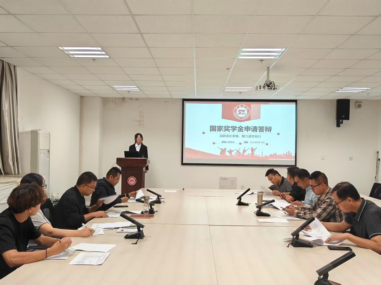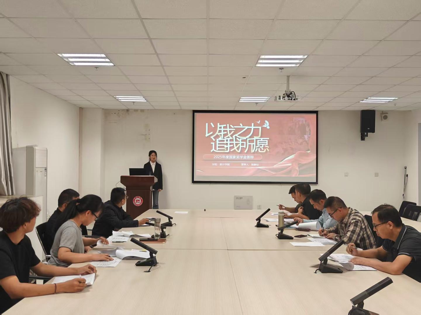 2025年9月18日19:00,数计学院在8-616会议室举行国家奖学金答辩评审会。本次评审会由学院党政领导班子成员、各系主任、教师代表、辅导员代表及学生代表共同组成评委团,对7名经年级专业推荐的优秀候选人进行公开评审。