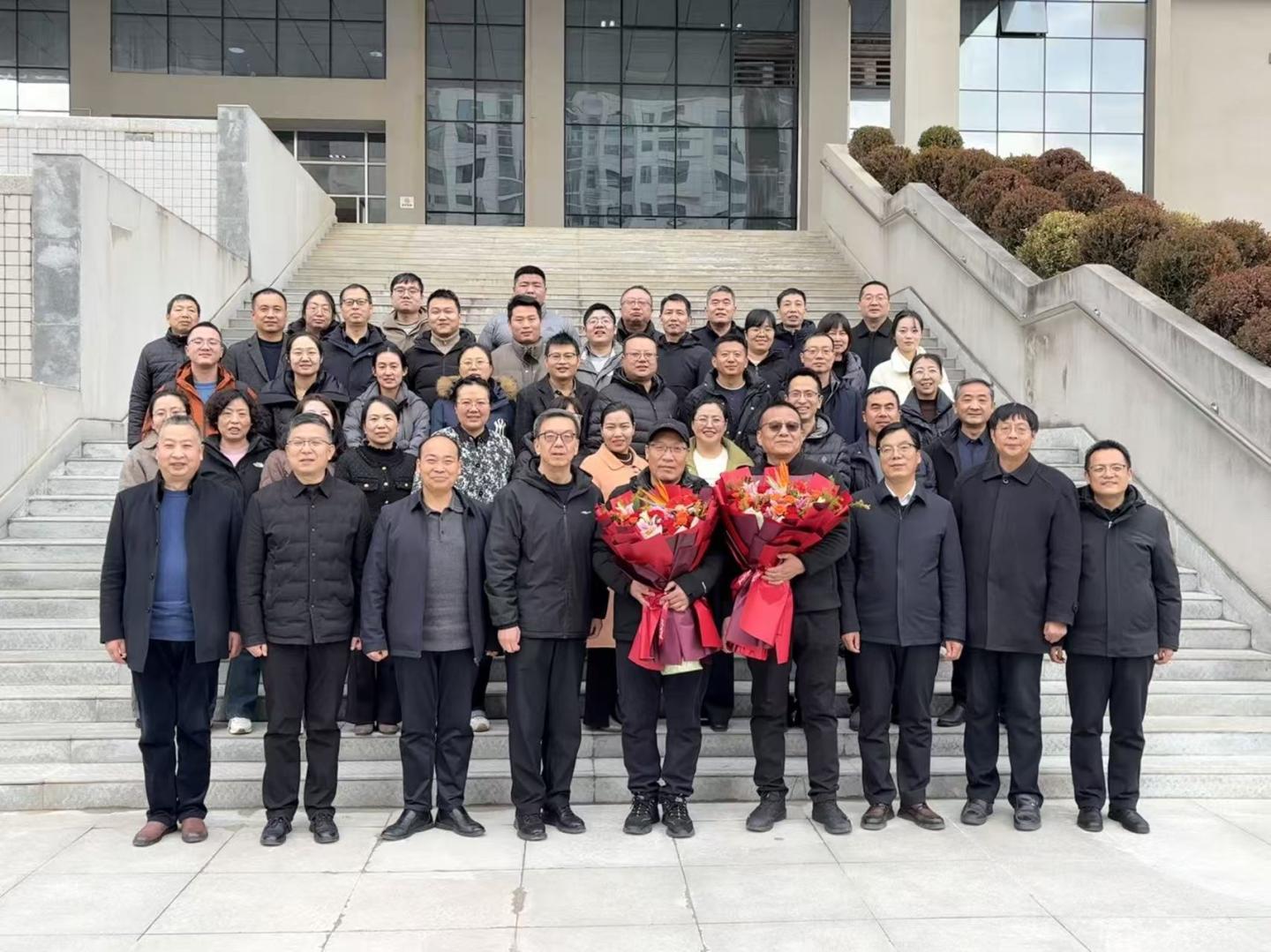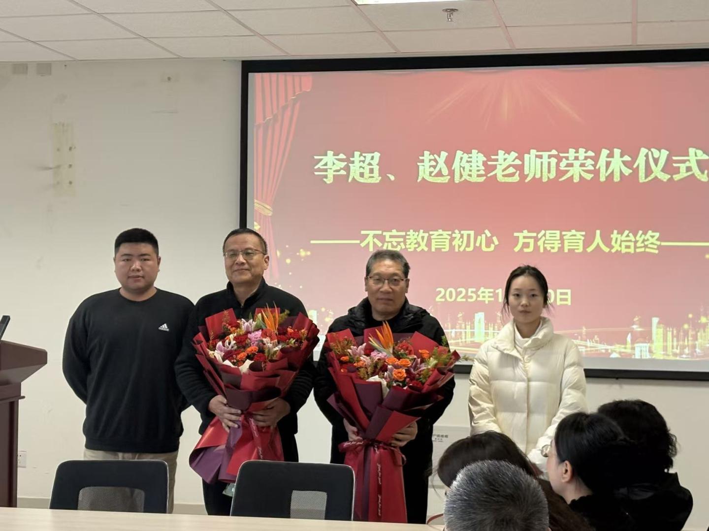 最后,全体参会人员与李超、赵健两位老师合影留念,为这场充满温情与敬意的荣休仪式画上了圆满的句号。荣休仪式的举办,不仅是对退休教师个人职业生涯的总结与肯定,更是学院文化传承的重要体现。在漫长的教育生涯中,李超、赵健两位老师宛如两座灯塔,以其渊博的学识、严谨的治学态度和高尚的师德风范,为青年教师们树立了光辉的榜样。我们坚信,在全体师生携手共进、砥砺前行的努力下,在老教师们精神的引领和青年教师们的奋勇拼搏中,学院定能在十五五规划的开局之年,书写更加辉煌灿烂的篇章,迎来更加光明璀璨、充满希望的明天。