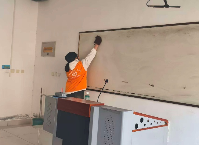 活动中,志愿者们分组行动、各司其职,手持清洁工具对教室进行全方位清扫。大家仔细擦拭黑板、课桌椅、门窗玻璃与多媒体设备,认真清理地面杂物、桌缝垃圾和墙角灰尘,细致整理课桌椅摆放,不放过任何卫生死角。志愿者们干劲十足、配合默契,用双手让教室焕然一新,为师生打造了干净、整洁的教学与学习空间。